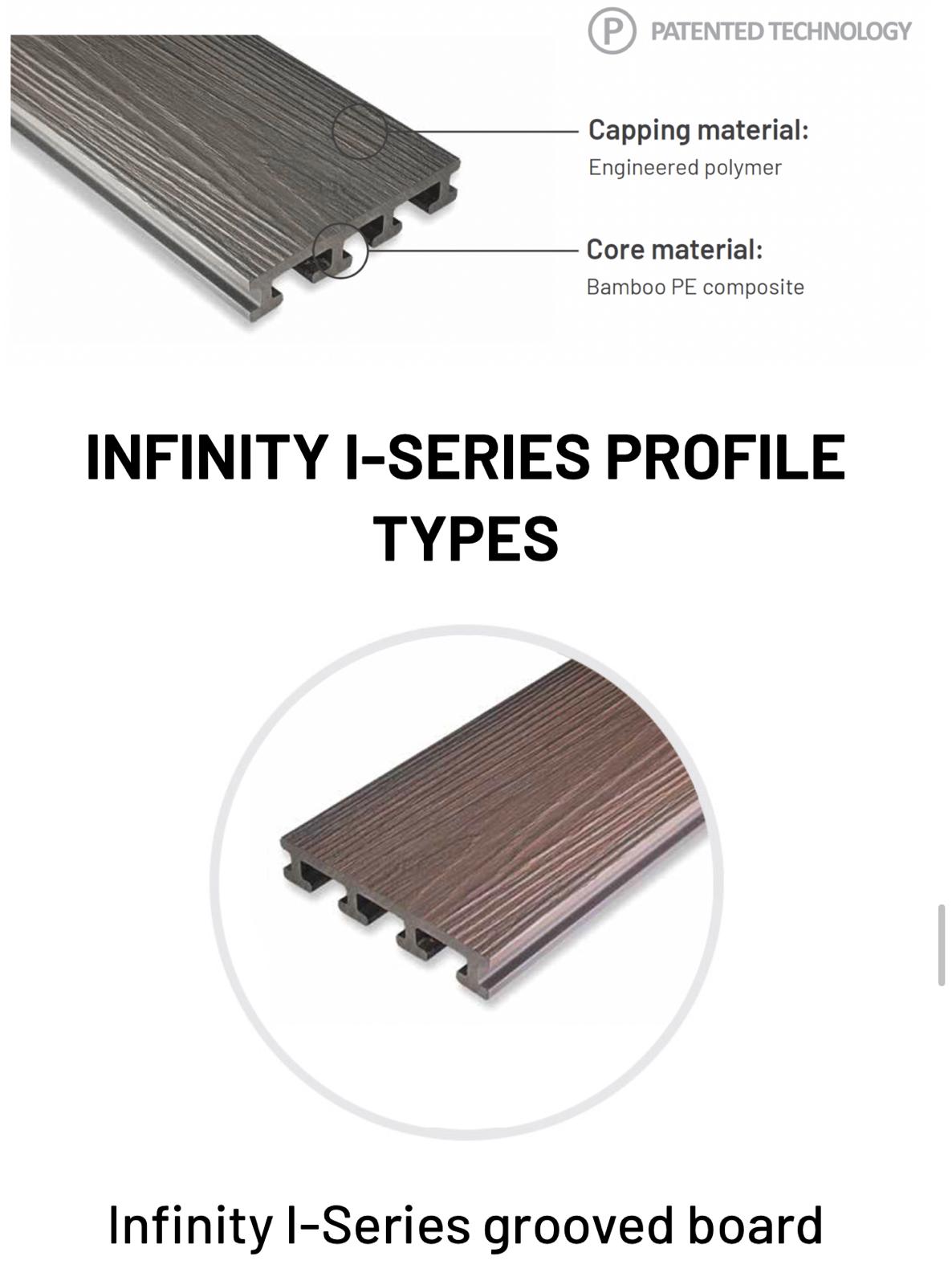 Revolutionary Bamboo Composition Unlike standard plastic decking, the Infinity I-Series Capped Bamboo Composite Decking utilises a unique bamboo-core formula. Bamboo is one of the fastest-growing renewable resources on the planet, making this decking an environmentally conscious choice. The “I-Beam” profile design not only reduces the weight of each board for easier installation but also improves structural integrity and heat dissipation, keeping your deck cooler underfoot during the summer months.